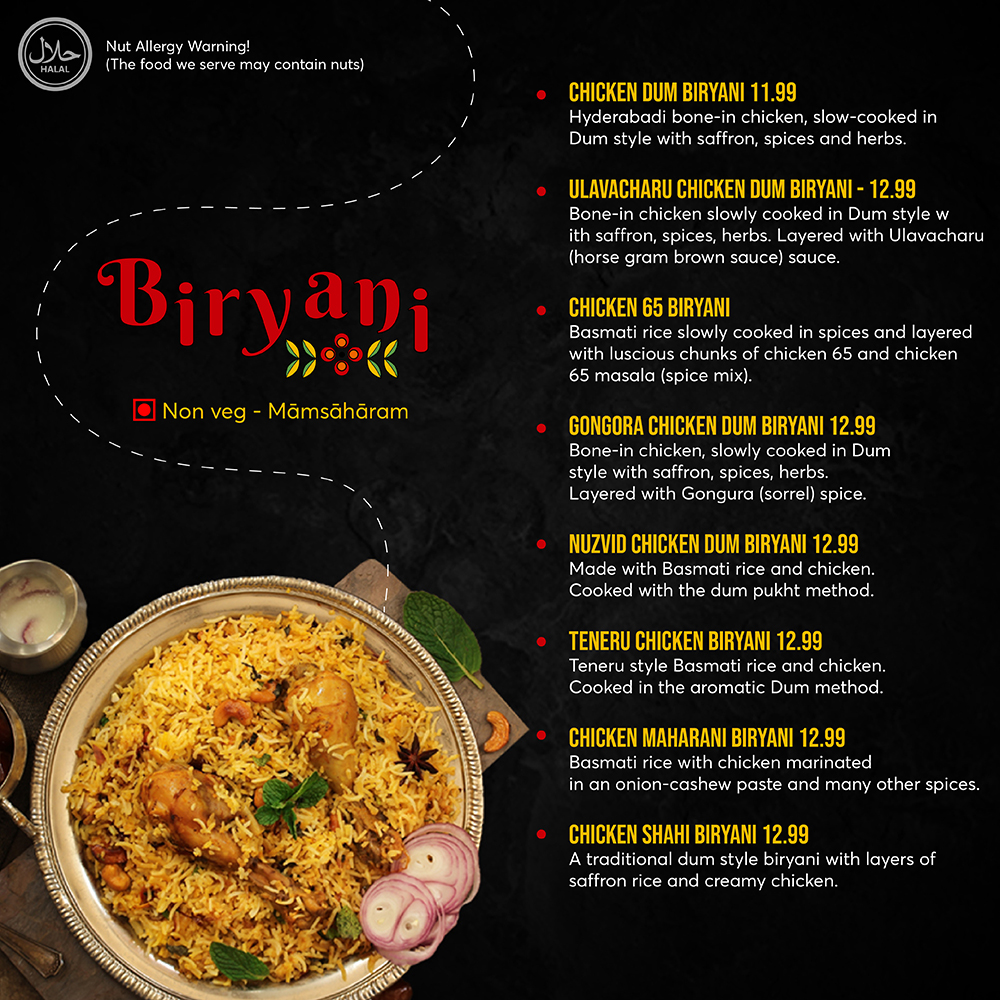 Hyderabadi bone-in chicken, rice slow-cooked in Dum style with saffron, spices, and herbs.