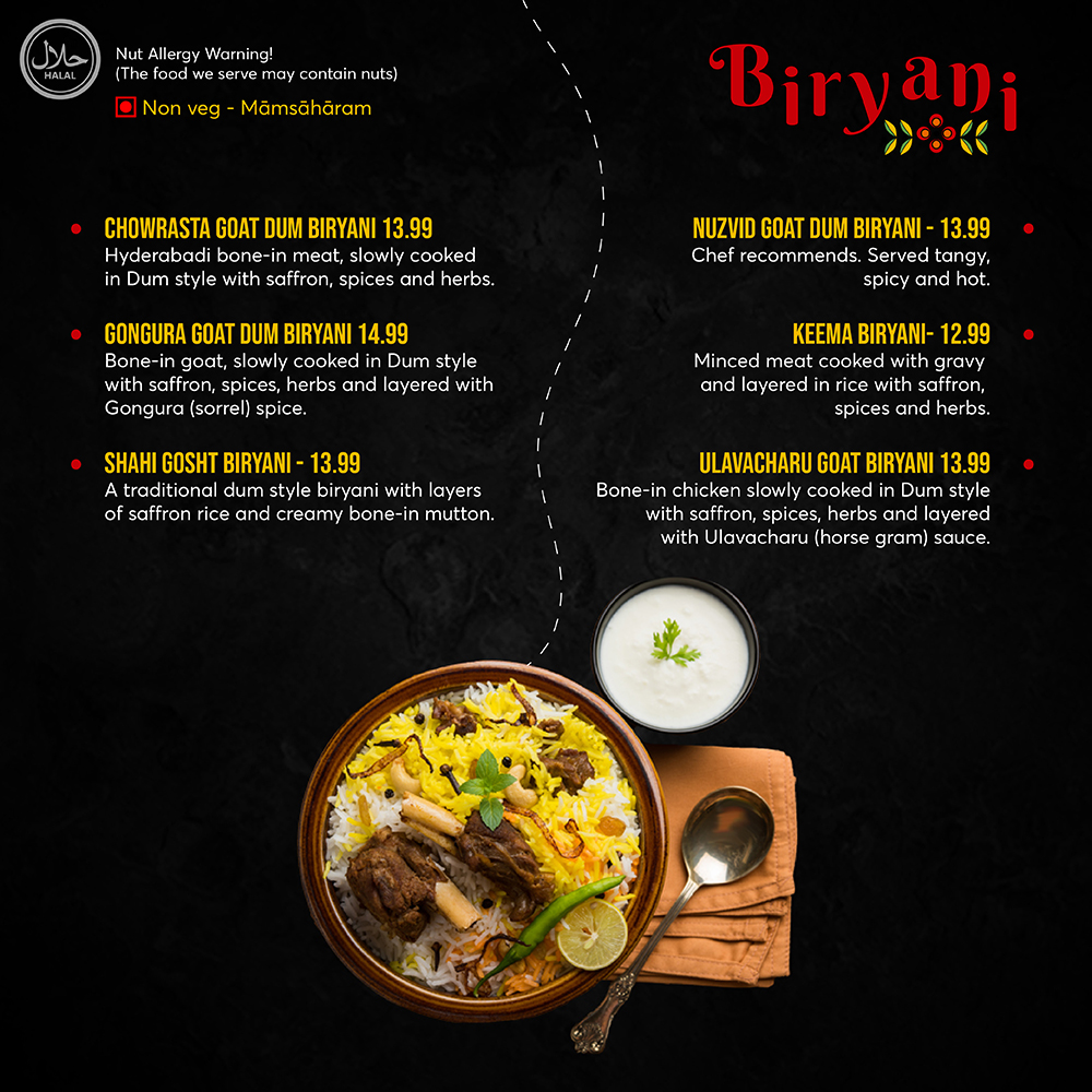 Hyderabadi style bone-in meat, slowly cooked in Dum style with saffron, spices, and herbs.